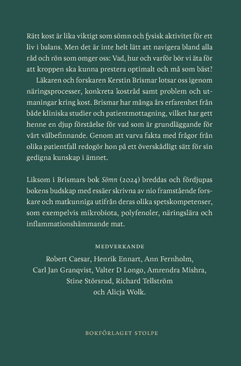 Kerstin Brismar har nyligen kommit ut med boken ”Kost – Hälsans hörnpelare” (Bokförlaget Stolpe). Här berättar hon om goda kostvanor för din hälsa, utifrån både patienterfarenhet och forskning. Boken innehåller även kapitel av andra kostexperter. (Klicka på bilden för att läsa mer.)
