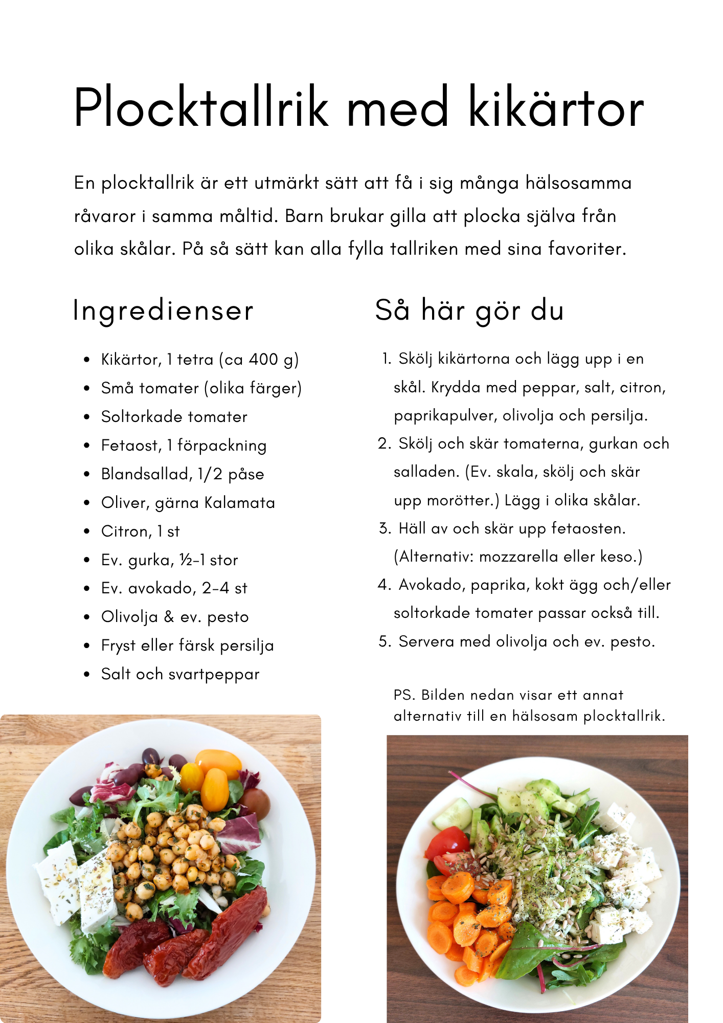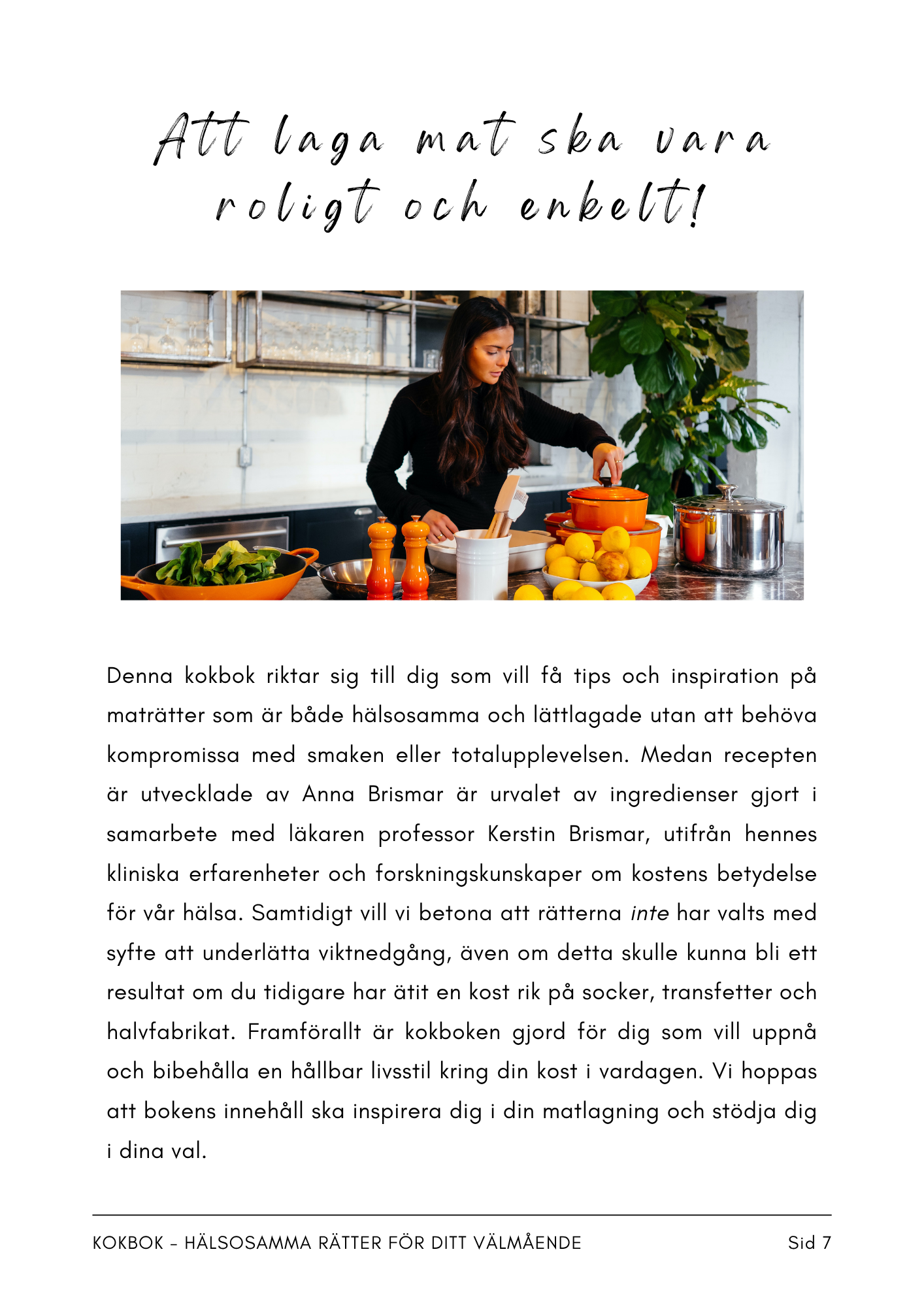 I kokboken delar vi, förutom recept, även tips, råd och forskningsrön om hur vi kan laga hälsosamma maträtter till vardags. Boken riktar sig till dig som vill få inspiration och tips för veckans alla dagar. Framförallt är den till för dig som vill laga mat själv från grunden, utifrån hälsosamma vanliga råvaror. Att laga bra och god mat behöver varken vara komplicerat, dyrt eller tidskrävande. Det är just enkelheten i matlagningen som vi vill betona, då många människor har fullt upp i vardagen med olika aktiviteter och/eller långa arbetsdagar. Recepten består därför av råvaror som i regel är lättillgängliga och begränsade i antal. Själva tillagningsproceduren är också relativt enkel och tillagningstiden anpassad för vardagen. Samtidigt tror vi på ett omsorgsfullt val av bra råvaror – gärna svenska och ekologiska. Om du har möjlighet att köpa närodlade grönsaker, rotfrukter och andra råvaror under sommarhalvåret – eller till och med odla lite grönsaker hemma – så är det fantastiskt! Som regel kan man tänka att ”ju mer närodlat, desto mer näring finns bevarade i grönsakerna” (även de som varit nedfrysta). Nederst i denna artikel ser du exempel på sidor från boken.
