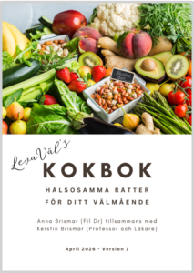 Leva Väl har fått en egen kokbok! I början på april (2026) delade vi för första gången vår nya kokbok, 50 sidor, med recept och foton på lättlagade och hälsosamma middagar, efterrätter och brödlimpor. Vi skickade ut kokboken tillsammans med vårt nyhetsbrev till alla prenumeranter. (Skriv upp dig som prenumerant här om du inte redan gjort det!)